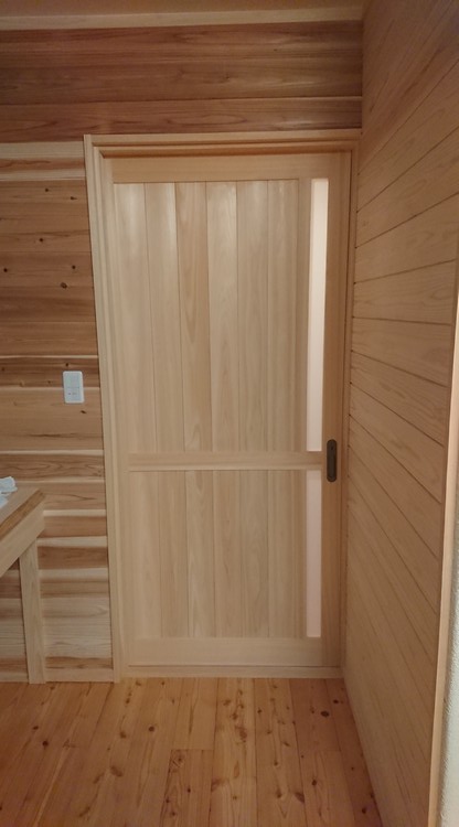 建具は基本、桧の枠に桧の小幅板を縦に建て込んだ意匠で製作しました。トイレや収納などの照明器具の消し忘れが発生しそうなところには、確認できるようにスリットを付けます。個室や物入などはスリットのないシンプルな意匠で、素材はいずれも龍神産の桧です。