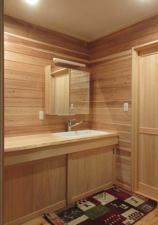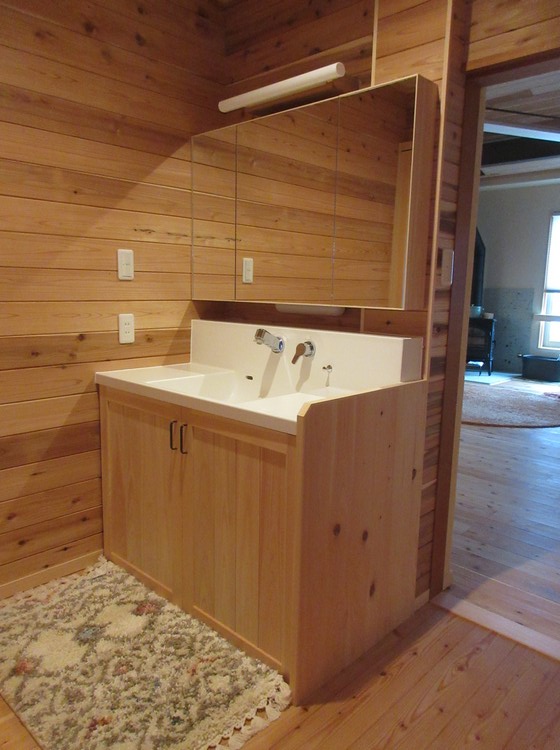 1階の洗面化粧台は、桧の天板に医療用の大きくて底が平らな陶器の洗面器を埋め込んだ天板を採用しています。作業スペースが大きく取れて実用的な洗面になりました。鏡の後ろには収納を付けています。ここでも家具工事は鏡収納だけです。天板は大工工事で、洗面器や水栓は給排水工事で、下部の扉は建具工事で造っています。全体で造り付け家具のように見えるように工夫しています。