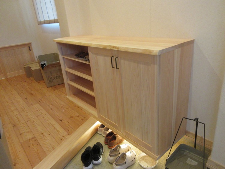 下駄箱は全ての部分を龍神産の桧で造りました。長さは1.8メートルほど。半分ほどは扉を付けましたが、半分は使い勝手を優先して扉は付けていません。内部の棚は全て可動式です。