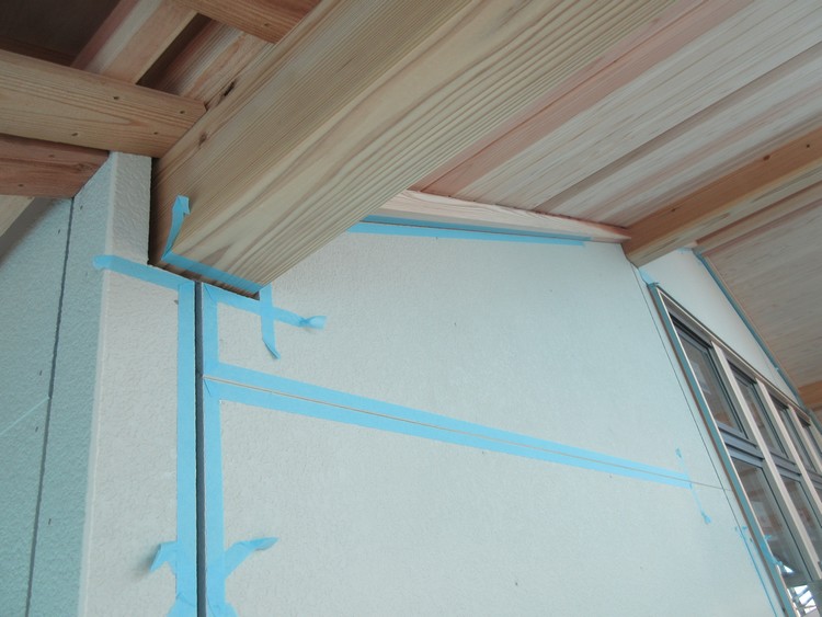サイディングの継ぎ目はコーキングで防水処理します。出来るだけ継ぎ目なく外壁は1枚に見せたい・・・ということから、いつもサイディング面から一段引っ込めるコーキング面にも、出来れば盛り上がるぐらいに・・・と要望を出してひと工夫してもらいました。