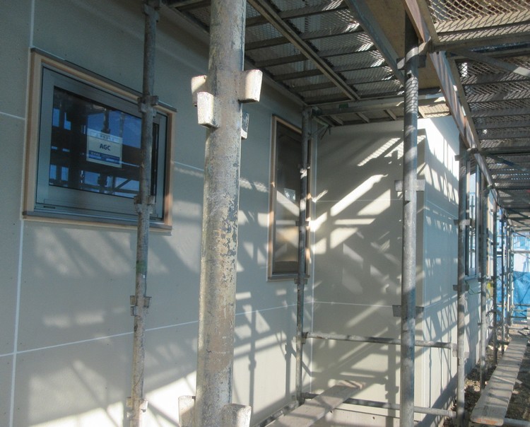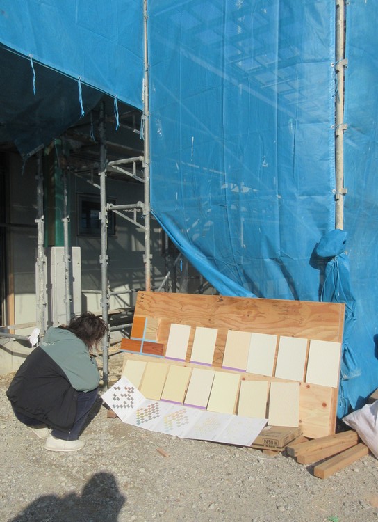 外部工事が進んできます。この時期に色決めも行います。候補になりそうな色の見本を作ってもらって実際に現場に持ち込み、臨場感を持って決めごとを行います。小さな色見本やカタログでは、想像と違った・・・などということにもなりかねません。外壁色などはその建物の印象を大きく左右するものですから、色決めひとつにも大きな責任が伴いそうで緊張感が漂います。