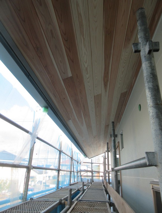 軒先には屋根面と同色のガルバリウム鋼板の角ばった軒樋がかかり、軒裏には杉板が張られ始めています。今回工事は驚くほど段取りが良く順調です。