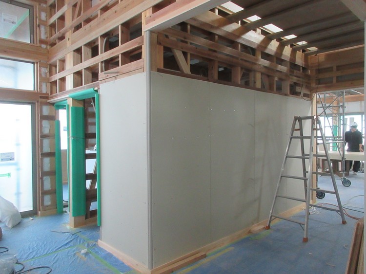 建物内部ではプラスターボード下地のラス板(横胴縁)の取付も終えて、いよいよボード張りの工程に入っています。