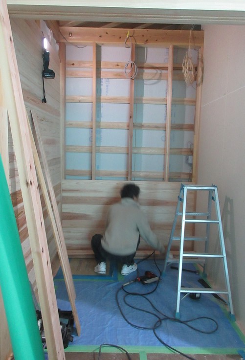 特に防火上の法規制のないところでは板類は柱・間柱に直接張っていきます。大きな部屋などで多人数が入るところには衝撃にもタフで色合いもおとなしく香り豊かな桧板を採用します。物入などで断熱性や調湿性が大事な部屋には杉板という使い分けです。