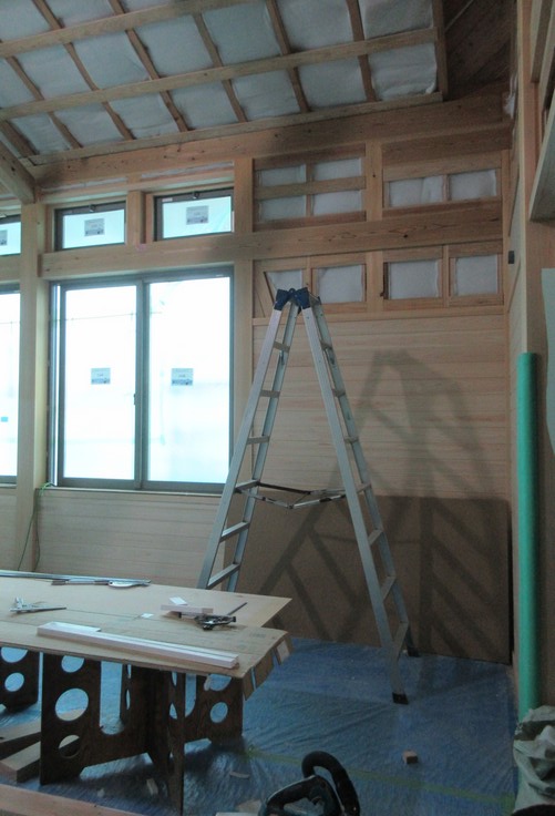 プラスターボードの上の仕上げは珪藻土塗、和紙貼り、杉板張り、桧板張りと、用途と部屋の性格によりいろいろに使い分けをしています。主に、玄関やロビー・廊下などの壁は珪藻土塗、壁の上部や天井は和紙貼り、大きな部屋の壁は桧板張り、物入の壁などは杉板張りといった具合です。