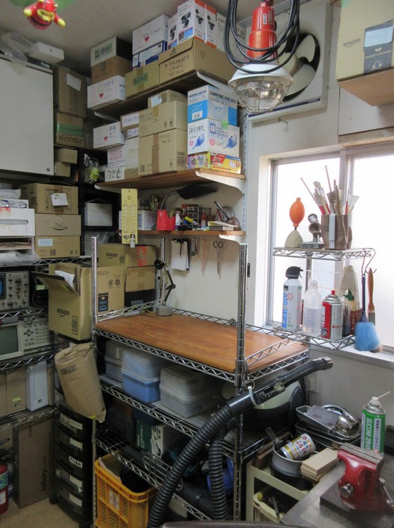 ご夫婦で創作活動はされているようですが、ご主人のお得意分野は電気関係。趣味が高じて電気工事士の資格まで取ってしまわれたそうです。在庫されている部品数も相当なもの、ご主人の部屋の壁一面に棚が組まれ、所狭しと部品や工具などいろいろなものが置かれていました。