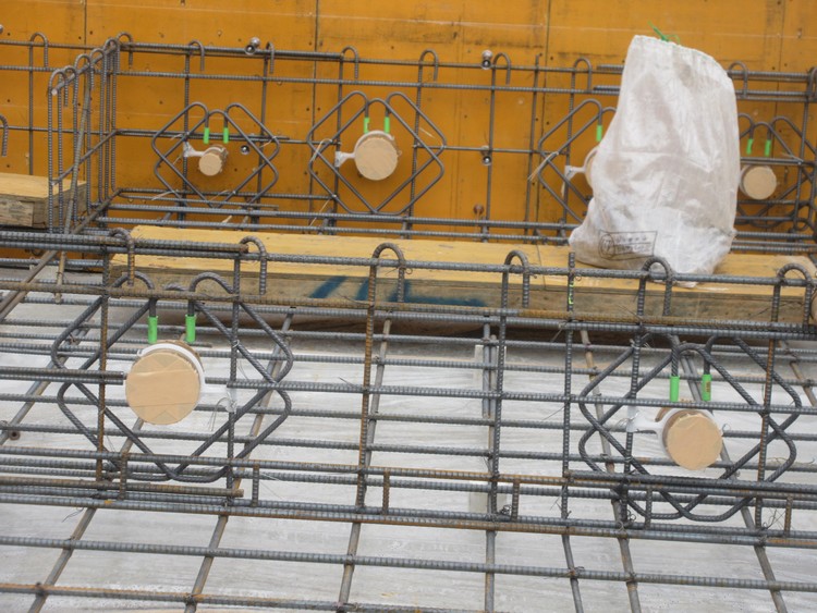 配管類も立ち上がりを貫通するときには一般の鉄筋コンクリート造の梁の貫通と同じ要領で補強します。現場の鉄筋組で補強筋を形成しても良いのですが、施工手間と施工精度のばらつきを考えると既製品を使用する方が良いことが多いので、写真のような貫通ヶ所の補強役物を使っています。