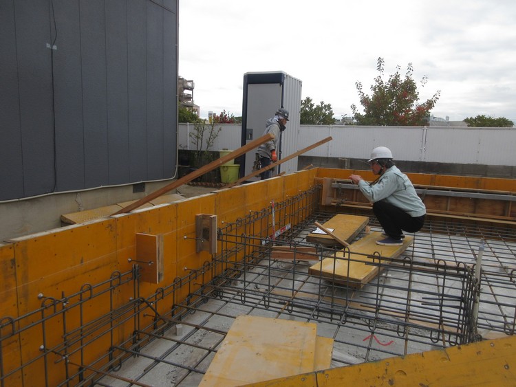 鉄筋が組みあがると審査機関の検査を受けます。確認申請で許可された通りの配筋であるか、継ぎ手・定着・余長などの配筋要領に間違いはないか、鉄筋の規格・種類・太さなどは合っているか、各部の補強は適切であるか・・・などが審査項目です。監理者としての設計事務所の配筋検査もこのタイミングで行います。審査結果は・・・もちろん、手直しもなく合格でした。