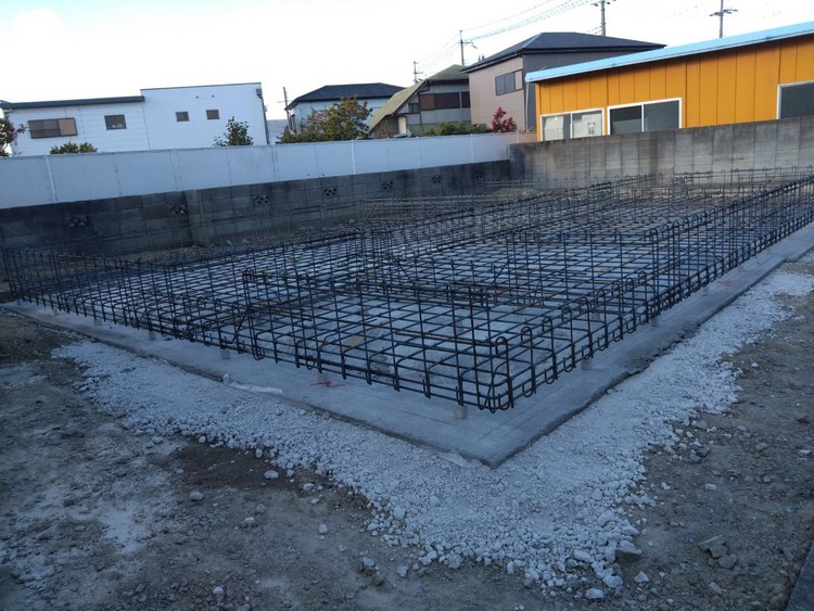 基礎の立ち上がりなどは地中梁として扱いますので、配筋は一般の鉄筋コンクリート造の建物などと同じように上部主筋・下部主筋・上下をつなぐスタラップ筋・配力筋などを意識して設計・施工します。スラブ(床)配筋は構造計算上はもっと少なくて済みますが、多くの職人がこの上に乗って作業しますから、一回り太い鉄筋で組み上げています。
