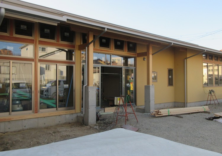 外部の工事が出来て、足場などが取り払われると、一挙に建物そのものが仕上がったような雰囲気になります。住宅ですと、次に簡単な外構や植え込みを仕上げれば本当の仕上がりです。しかし、この施設ではこれから玄関先の車寄せ工事が始まります。車寄せは鉄骨造ですから、まずは基礎づくりから・・・まだ完成は少し先です。