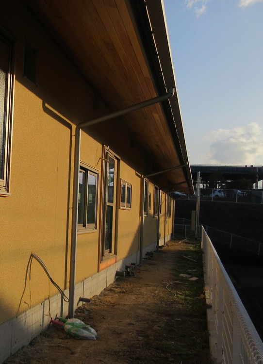 軒樋・竪樋も施工できています。いずれも素材はガルバリウム鋼板で、装飾性の強くないものを選んでいます。色は出来る限りアルミサッシに似た色を選びました。平屋で大屋根の建物なので、屋根面積が大きく、それぞれの樋の排水許容量を適切に計算していくと、竪樋は住宅などの見慣れた建物よりは多く必要になります。