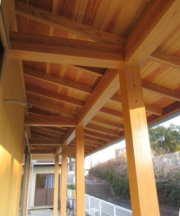 外部の見えがかりの木部は透明の木材保護塗料を塗っています。透明ということもあって、色は意識できません。少し艶が出たかな・・・というぐらいの仕上がりです。直接雨・風・紫外線にはさらされない軒裏や屋根の直下ではこのままきれいでいてくれるでしょうが、柱の下部など雨・風・紫外線にさらされがちなところは、3年を過ぎたころから少しづつグレーに変わっていきます。木材そのものの自然な退色なので、それを受け入れて色の変化を楽しみたいものです。