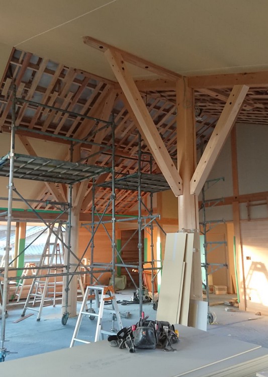 内装工事は天井のプラスターボード張りに移っています。下地と見切・廻り縁などの造作工事は大工が行い、ボード張りそのものはいつも軽量鉄骨天井などを手掛ける内装屋が分担しています。下地とボード張りが同時に進んでいきますので、工期短縮には有効な工夫です。