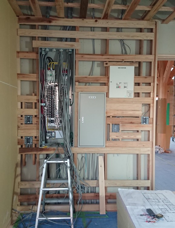 設備工事も進んできました。写真は電気や防災などの設備の集中する事務所の壁の様子です。建物規模からすると、大変な量の配線類で工事も大変ですが、だからこそ利用者も快適に使用できて、手厚く守れるのです。