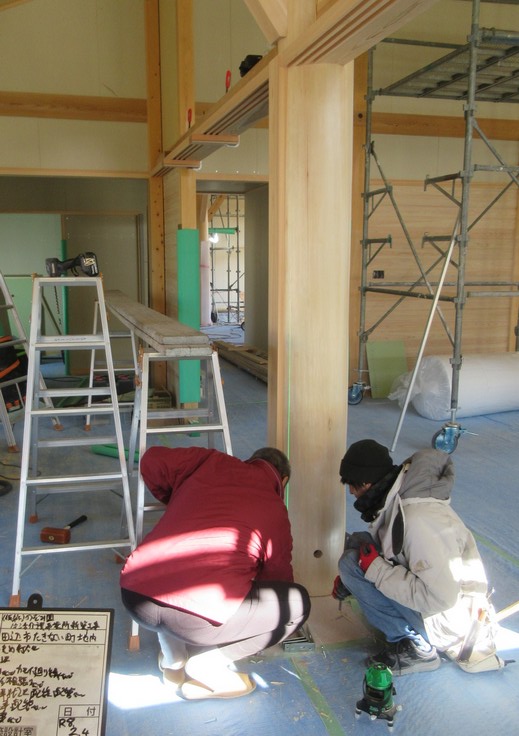 プラスターボードや桧・杉の板類を張り終えて、詰めの造作工事が進んでいます。この現場では丸太の柱を使ったので、定型に製材された木の細工とは違って、1本1本に応じた細かな建付け・納まりが必要になってきます。