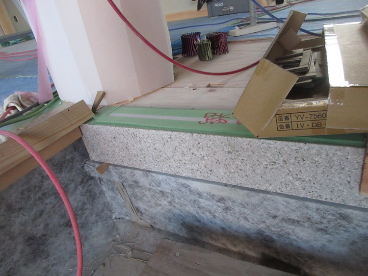 玄関の上がり框に採用したものは磨き仕上げです。直接屋内の一般床と接しますので、凸凹は許容できません。きれいに研磨されていて艶があり、キッチンの天板や調理台などにも採用される仕上げです。磨き仕上げとすると、色は他の物よりより濃く(黄色く)見えるようになります。