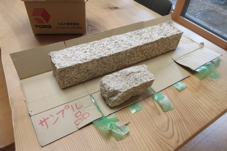 最初の写真の上に写っている長い方の石は玄関ポーチの段石として採用した石です。当初は自然で手造り風味の割肌(短い方の石仕上げ)を使う予定でしたが、たくさんの方が通る玄関ポーチであるので段差はなるべく小さくしたい・・・という思いからノミ仕上げに変更しました。割肌に比べると随分と成形がしっかりしていて段差も少ないので安心です。