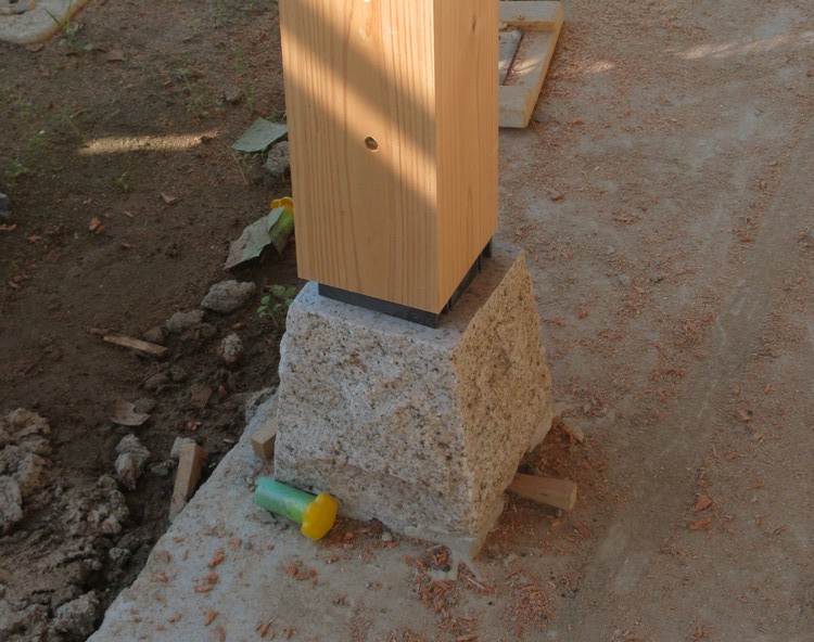 屋外の下屋の柱を支える柱の下の束石は割肌仕上げです。あまり手を加えず、最初に石を割った時のようなおおらかな自然な仕上げとなっています。錆御影と呼ばれるこの黄色っぽい花崗岩は、建物の基礎や墓石にも使われる丈夫な石なので、経年劣化や衝撃による破損の心配が少なくて済み、大きな荷重のかかるヶ所でも使える石です。