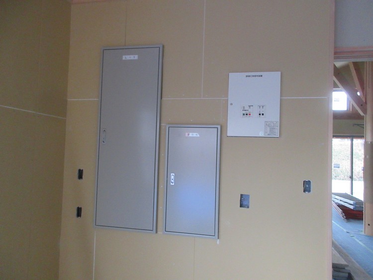 分電盤、端子盤、火災報知機などは事務室に集中していて、ここですべての管理をします。住宅のように物入や倉庫などの隅に設置すれば事務室の壁もきれいに納まりますが、人を預かる施設などでは、万が一のときに迅速に効率よく・・・の方が優先されますので、管理者のいつも見えるところに集中させておきます。