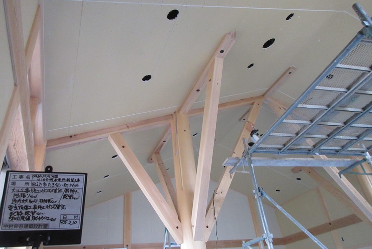 屋内の下地はほとんど出来ていて、後は仕上げを待つばかりです。この段階が器具の取付穴をあけるタイミングです。仕上げてしまってからでは折角の仕上げ面を傷つけてしまうことにもなりかねません。天井のプラスターボードに空いている穴は照明器具や非常用照明・火災報知機などの取付く穴です。