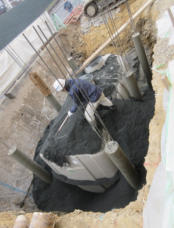 浄化槽は、使用人員に合わせて住宅よりは大きめです。まず浄化槽用の床版コンクリートを施工して、その上に据え付けます。車などの重量物が上を通らなければそのまま周囲を砂で埋めていくのですが、この場所には食材を運んでくるトラックなども乗りますので、その荷重が浄化槽に直接乗らないように、浄化槽上部の保護コンクリートを支える柱も建てています。