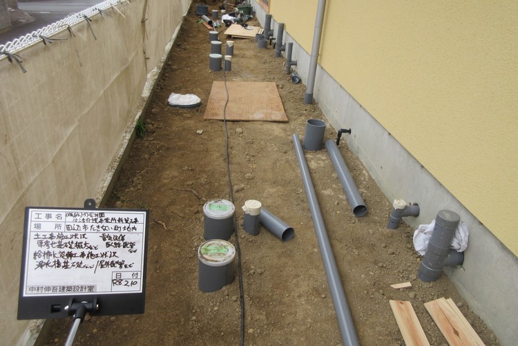 給排水の外部配管工事も、外部足場が撤去されたこのタイミングで集中的に入ります。排水管類はトイレからの汚水と、洗面所や配膳室などの雑排水とに分けて建物外に出しますので、外部配管も結構な量になります。