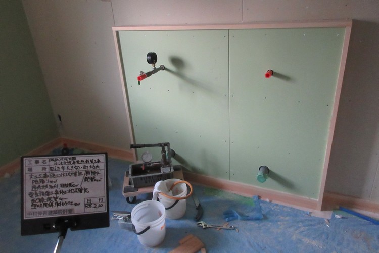 内装の下地工事の進捗にあわせて、給排水工事も隠蔽部(出来上がると見えなくなる部分)の仕込みを終えています。給水などの配管類は器具を据える前に水密検査をしておきます。トイレの壁仕上げはエコカラットタイル貼りです。下地はプラスターボードで和紙などの下地と同じですが、水の心配が高いヶ所には耐水性の高いものを使います。
