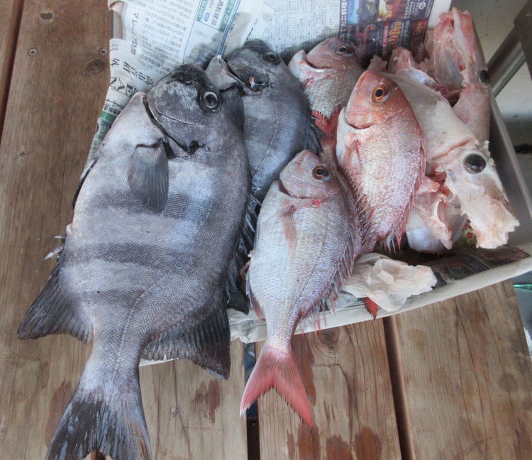 他に頂いたのは、手の平より少し大きいぐらいで塩焼きにして一人前でちょうどいいくらいのタイを5匹、ウマズラハゲ(ラケットハゲ?ウスバハギ?)を3枚・・・一番右で恐竜の化石みたいになっているのがウマズラです。こいつも薄造りや鍋でとっても美味しくいただけます。