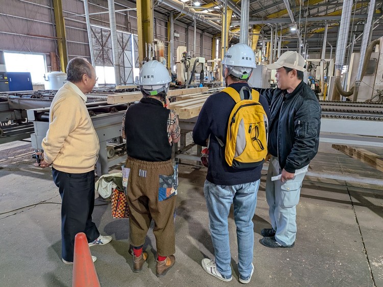 木材の加工をしてくれるのは田辺の山長商店です。折角の機会なので、工場内を案内していただきました。原木が搬入されてから、製材されて乾燥されて裁断加工される工程のすべてを見ていただきました。めったにない体験だったろうと思います。
