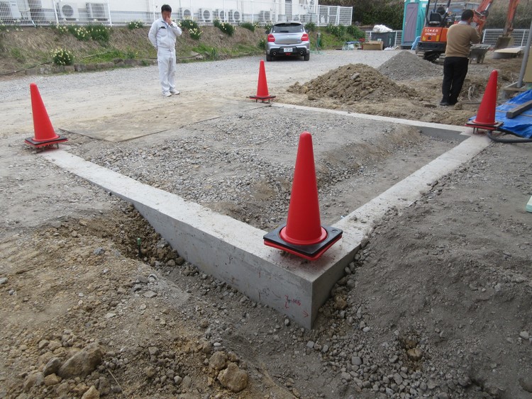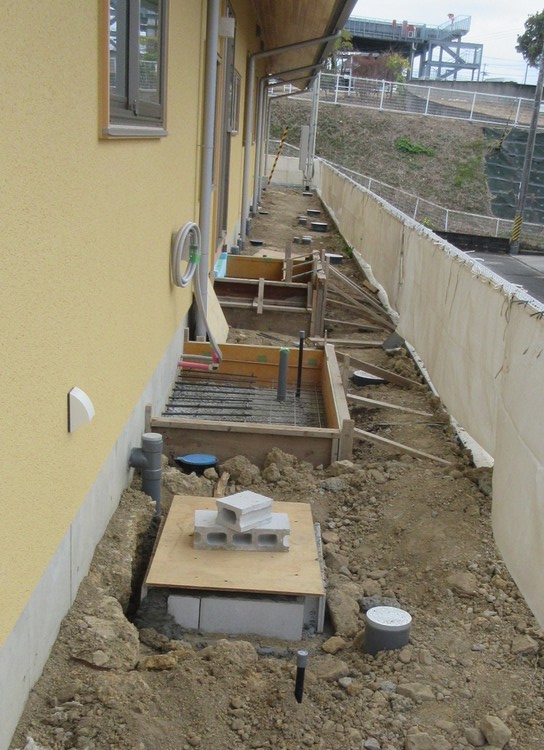 外部の電気・給排水工事などとともに、給湯設備などの設備基礎や、勝手口のたたきのコンクリート打ちの準備なども行われています。