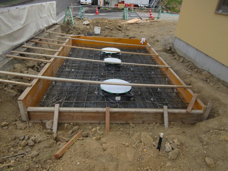 浄化槽上部の保護コンクリートもこのタイミングで、他の土間類と一緒にコンクリート打設します。保護コンクリート内の配筋は一般の土間コンクリートの場合とは違い、車が乗ることも想定して本格的に上下2段に組み上げます。地中から伸ばしてきた柱の配筋は保護コンクリートの配筋に定着を取り一体化します。マンホールなどの開口部の補強筋もしっかりと入れておきます。
