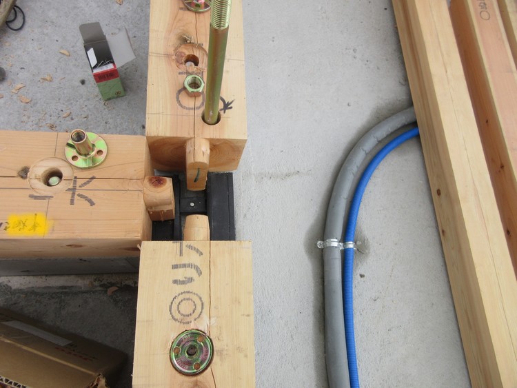 柱は、プレカットでは土台に乗せるのが標準ですが、それでは柱の土台への食い込みが起こり、長期的に見たときにはリスクを抱えることにもなりかねないため、特に力のかかる通しの柱や出隅・入角の柱などは基礎に直接落とすようにしています。木は縦方向には強くても横方向の力には弱いものです。