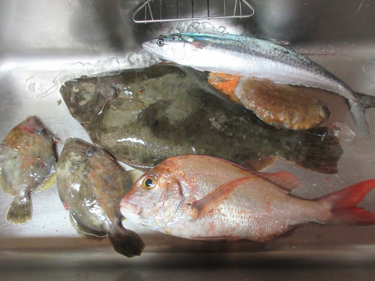 さて、今回の目玉はヒラメ。ヒラメは旬を迎えてこのところ多く見かけるようになりました。1キロぐらいのものから、中には4キロを超えるような大物までいます。以前に4キロ超えを買って帰ったこともあります。しかし、どうもなんか大味なような気がして・・・最近では2キロぐらいが食べ頃かな・・・と思っています。他には1.5キロほどのタイ、1キロちょっとのサワラ、大きいめのカワハギと赤ナマコが今回の獲物です。