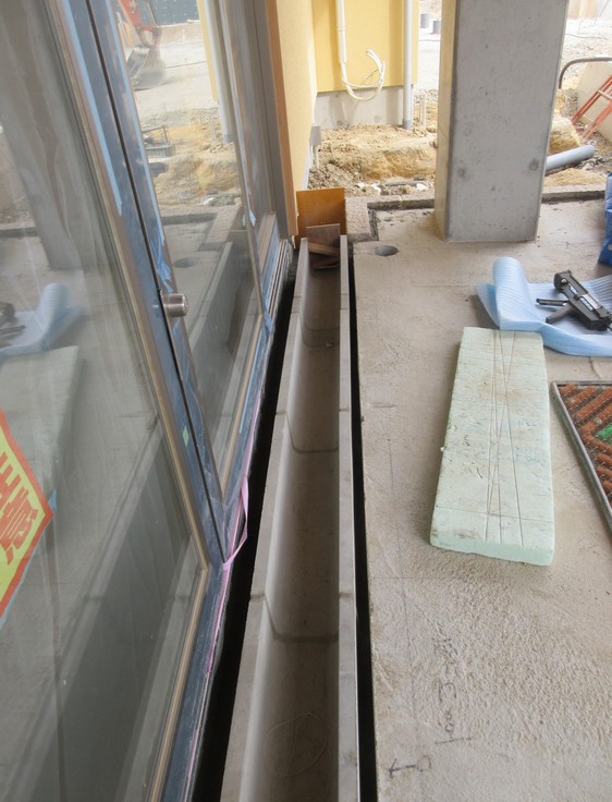 車寄せには屋根があるとはいえ外部です。大雨や強風のときにはそれなりに影響が直接玄関扉にも及びます。そこで、扉の直前に小型の側溝を用意して、雨水の屋内侵入を防ぎます。側溝に入った雨水は、大屋根から樋を経由して集まってきた雨水などとともに敷地外に排出します。もちろん側溝には細い目のグレーチングを敷き込みますので通行に支障はありません