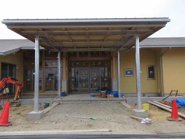 すでに軒樋や照明なども付いていますので、上部の工事はこれで仕上がりです。軒裏は基本計画の当初は桧板を張る予定でしたが、救急車の車高がアンテナを含めると想定以上に高かったので、構造体をきれいに整理し、軒裏の仕上げ張りを省略してすべてをあらわし仕上げとして、救急車が支障なく通れるように天井高を稼いでいます。