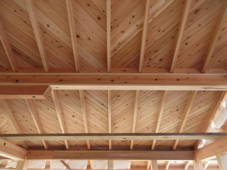 通常の天井板とは違い、斜めに張られた杉の化粧野地板は構造体も兼ねていて、建物全体の耐震・耐風性能の向上にも寄与しています。まっすぐに張られた野地板に比べると、屋根に約1.6倍の剛性をもたらします。ちなみにこの建物では、耐震等級3・耐風等級2の現在ある基準の最高値を確保しています。