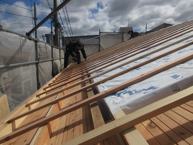 外部となる軒裏などは建物強度に関係がないため、垂木に対して直行するように化粧野地板を張ります。外壁と屋根の間にあるスリットは、壁の通気層を上がってきた温まった空気が屋根の換気棟に至るために必要な大切なルートです。