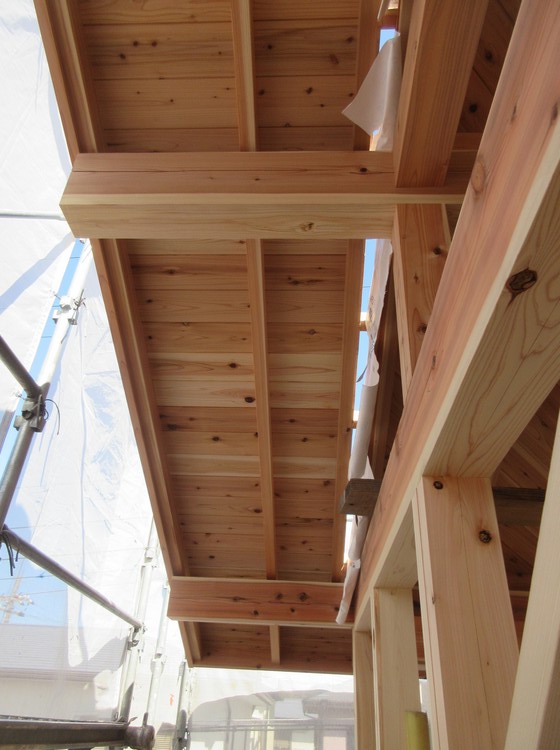 びっくり土間の家では、2階の各部屋の天井は杉の化粧野地板あらわし仕上げです。建物が完成しても、写っている写真のままに梁や垂木・野地板があらわしとして見えている、木の家らしい天井です。